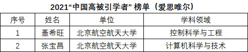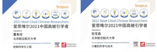 2022年4月14日,爱思唯尔正式发布2021 “中国高被引学者”榜单。北京航空航天大学有51位学者入选,人工智能研究院董希旺教授、张宝昌教授入选榜单。