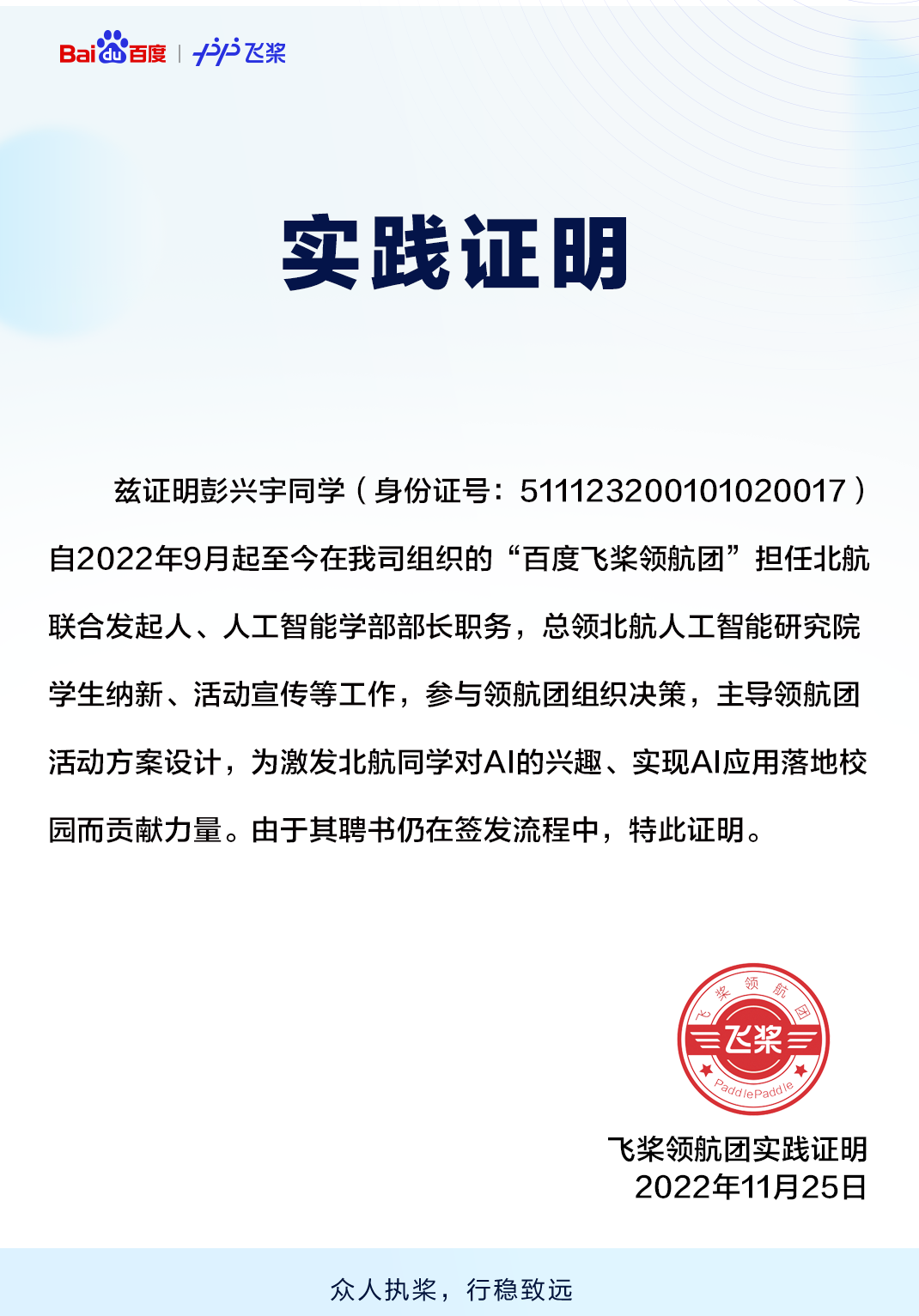 在个人成长的同时,彭兴宇同学也不忘帮助同学们一起进步。作为人工智能研究院学业支持计划的主要负责人之一,彭兴宇同学为14门专业课程编写复习资料,开展课程答疑活动10余次,并参与构建研究院首个学习资源分享平台。作为百度飞桨领航团的北航联合发起人,彭兴宇同学也积极组织技术沙龙、竞赛宣传等活动,为普及人工智能知识而贡献力量。