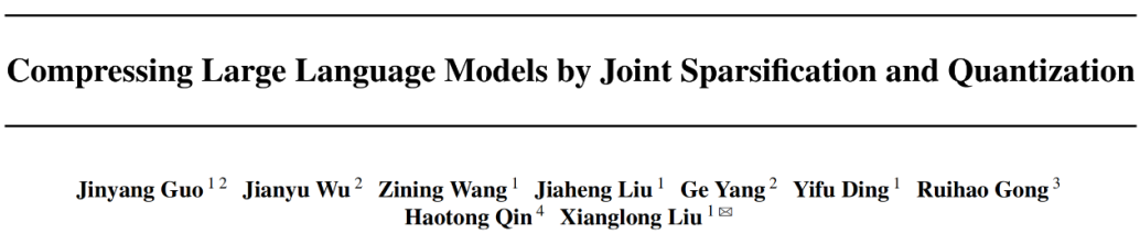 在本文中,我们提出了一种全新的大型语言模型(LLM)压缩方法——联合稀疏量化(JSQ)。传统方法仅使用稀疏化或量化导致其在高压缩率下模型性能崩溃,且传统稀疏化方法倾向于保留对量化有害的离群值,因此我们引入了一种新的稀疏度量作为桥梁,实现稀疏化和量化的联合优化,从而解决了这个问题。此外,离群值在LLM的性能中起着重要作用,但离群值的存在也阻碍了模型的进一步压缩,而现有的解决方案与量化过程高度耦合,不利于稀疏化。为了解决这一问题,我们设计了一个基于搜索的激活编辑器,能够自动去除相对无用的离群值,从而在离群值处理和模型压缩之间取得平衡。最终,在各种数据集和模型架构上的综合实验表明,JSQ框架有效实现了大型语言模型的高压缩率,同时保持了模型的性能。
