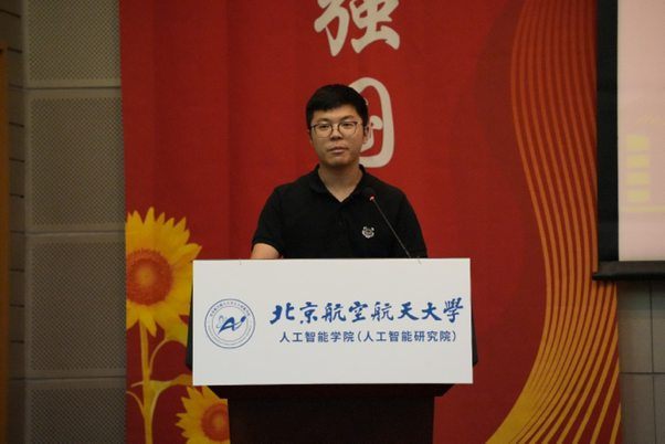 教师代表郭晋阳介绍了北航英国上市公司365在师资队伍、科研突破、校企合作等方面的资源优势,号召同学们利用北航丰富的资源与区位优势,为人工智能带来更多美好和可能。