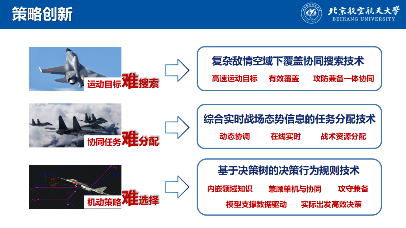 针对赛题要求,团队从无人机集群超视距空战作战特点出发,按照作战任务流程,分解为协同搜索、目标分配、机动攻防三个关键过程,并针对其中面临的“运动目标难搜索、协同任务难分配、机动策略难选择”等难点进行攻关,最终,基于“模型支撑、数据驱动”的思路,创新设计了攻防兼顾、智能协同、高效决策的内嵌领域知识的无人机智能协同博弈决策技术。