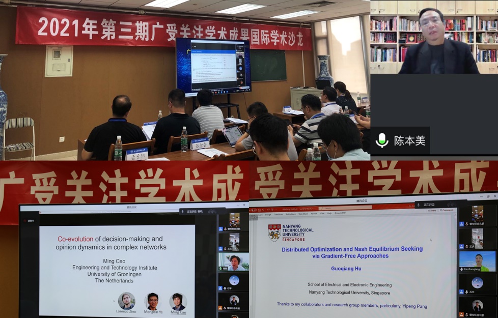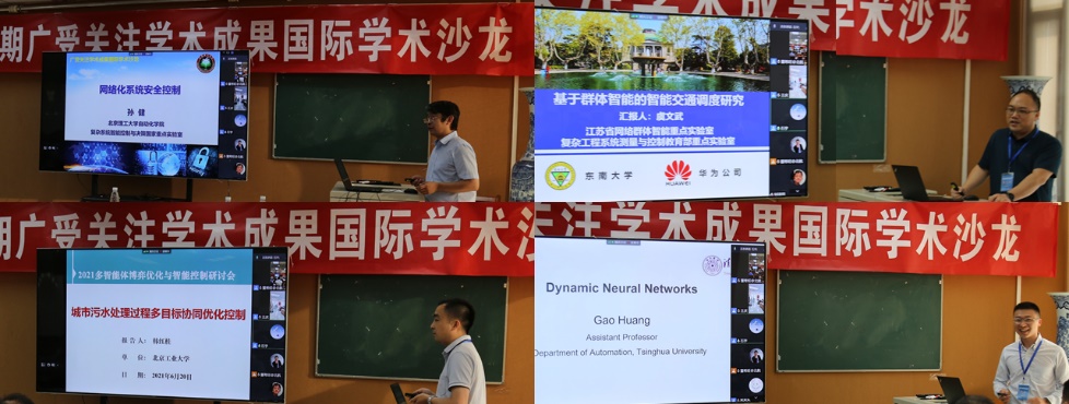 香港中文大学/新加坡国立大学陈本美教授、荷兰格罗宁根大学曹明教授、新加坡南洋理工大学胡国强教授、北京理工大学孙健教授、东南大学虞文武教授、北京工业大学韩红桂教授、清华大学黄高助理教授等8位学者分别做了题为“执行器受限的异构多智能体系统的协同与防撞控制”、“Co-evolution of decision-making and opinion dynamics in complex networks”、“Distributedoptimization and Nash equilibrium seeking via gradient-free approaches”、“网络化系统安全控制研究进展”、“基于群体智能的智能交通调度研究”、“城市污水处理过程多目标协同优化控制”、“Dynamic deep neural networks”的特邀大会报告。线下和线上的参会代表围绕报告内容开展了广泛的交流,并对新一代人工智能背景下多智能体博弈优化与控制存在的难点以及未来可能的研究热点进行了深入的探讨。