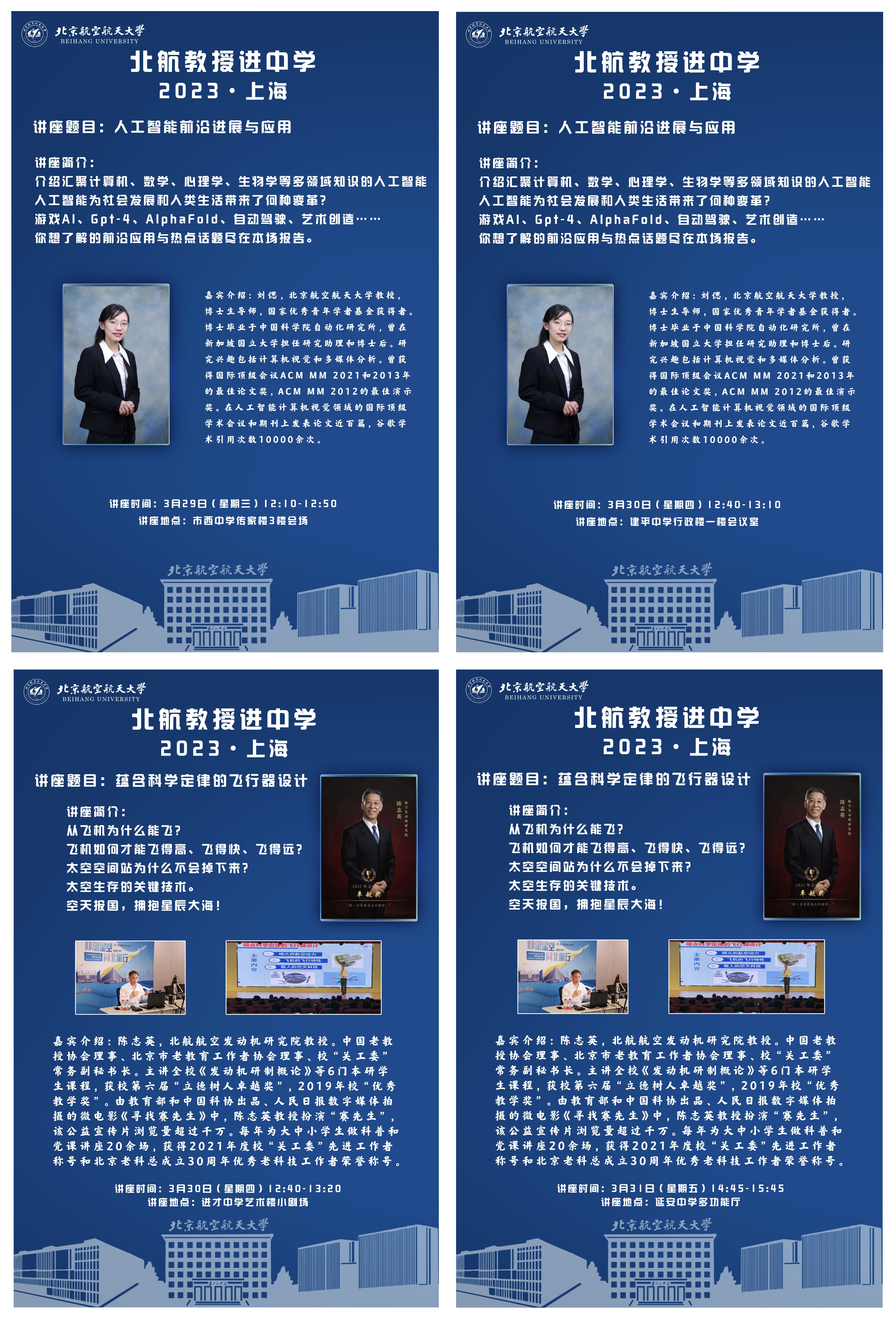 3月29日至31日,北航上海招生组一行赴上海开展“教授进中学”和招生咨询宣传活动。航空发动机研究院陈志英教授、人工智能研究院刘偲教授分别走进进才中学、延安中学、市西中学和建平中学开展“教授进中学”活动,为同学们带来航空航天领域和人工智能领域的... 查看详情>>-